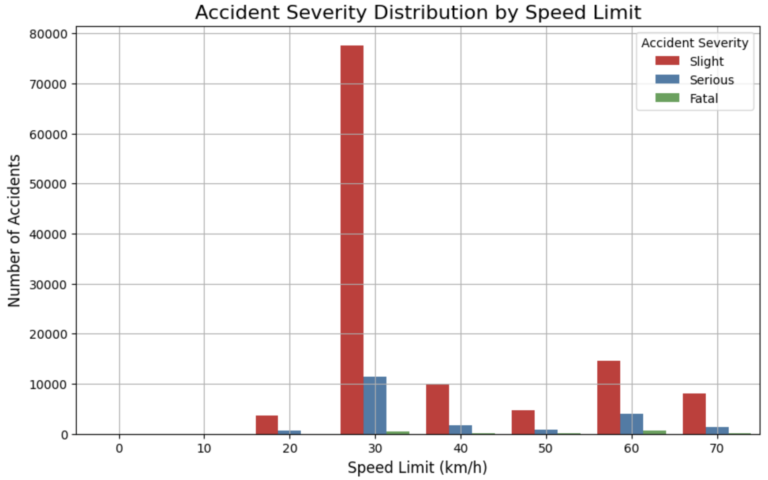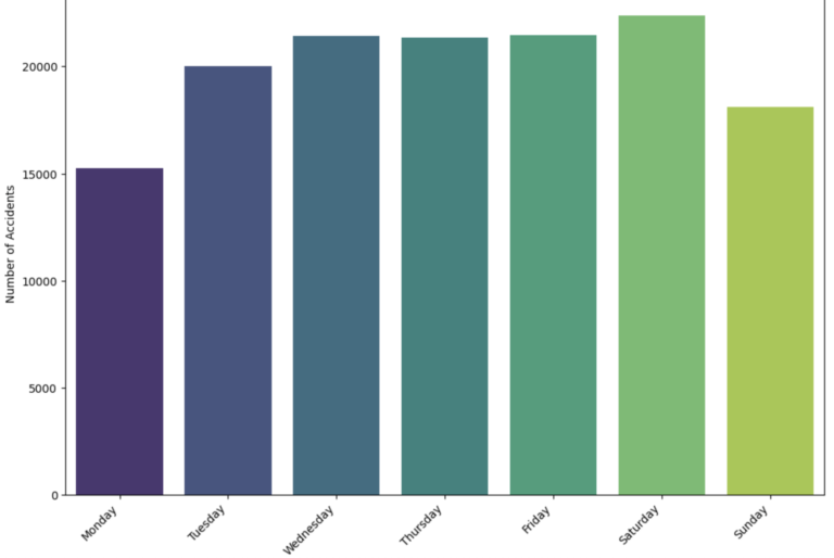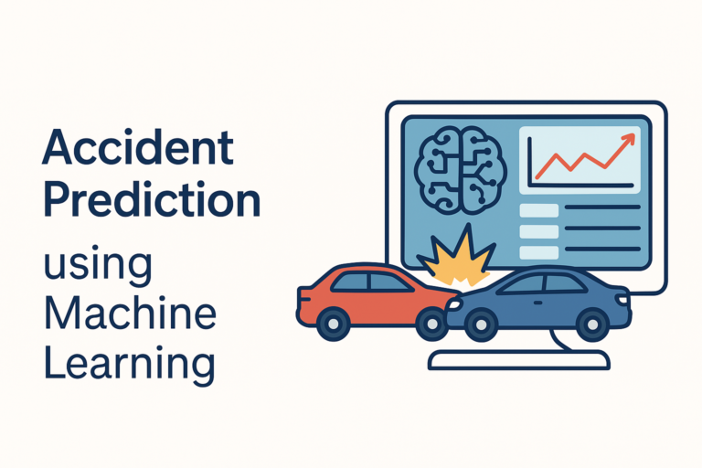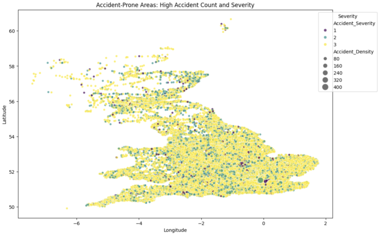 The project talks about predicting traffic accidents. The output is categorized as accident severity on a different range, and the problem is handled as a machine learning classification problem. Bar graphs, line charts, histograms, and other visual aids have been used to illustrate the findings. Additionally, a map showing the locations of different accident-prone zones has been created. It was made possible by the dataset’s information on the latitude and longitude of these locations.